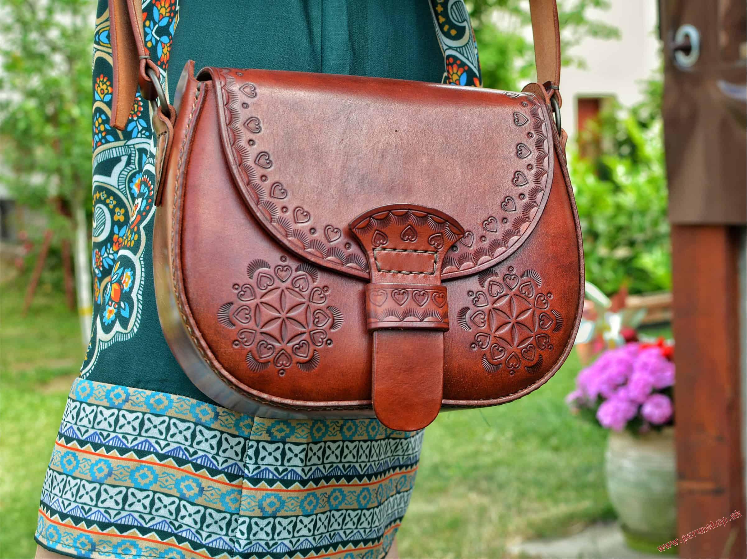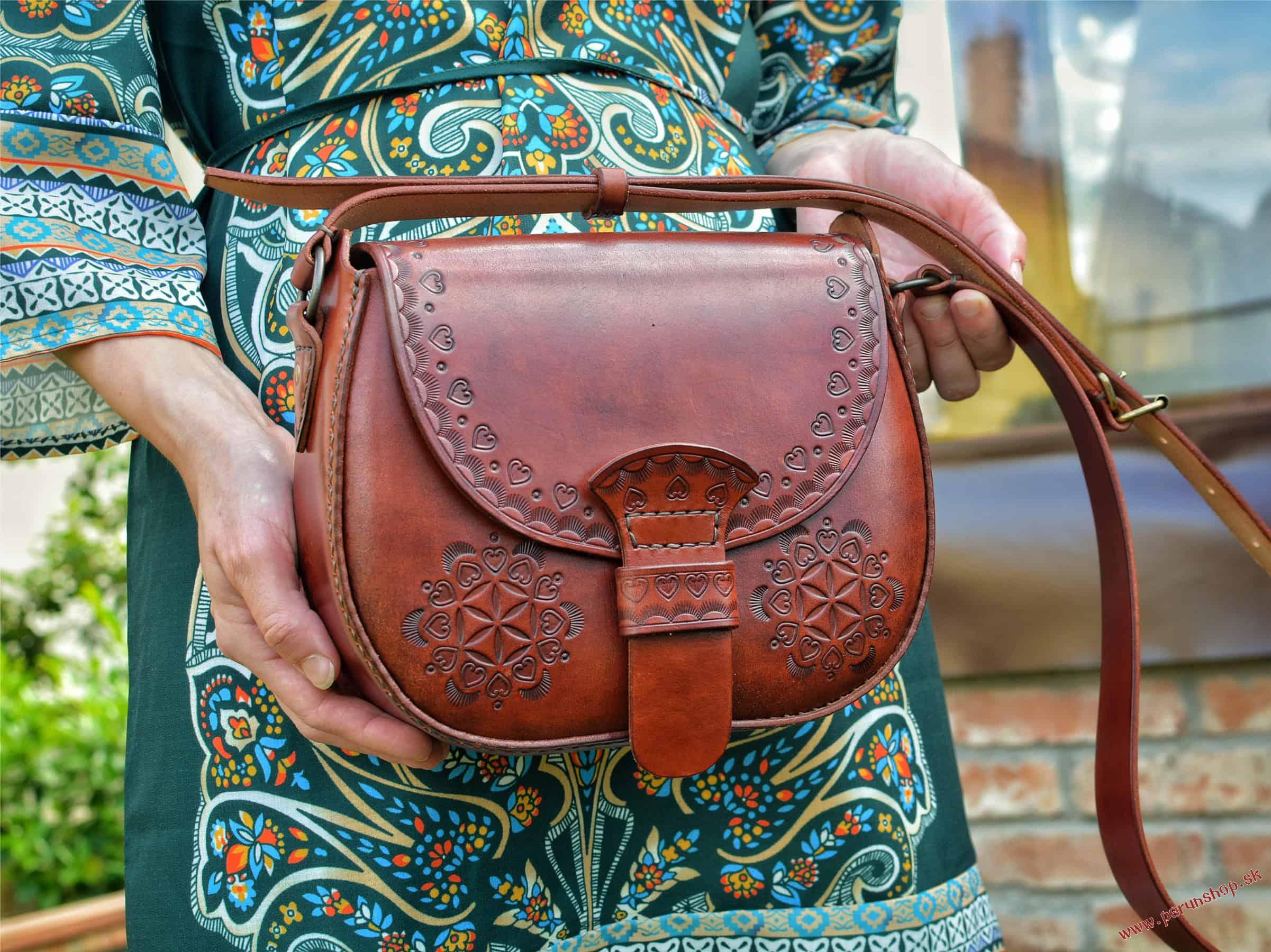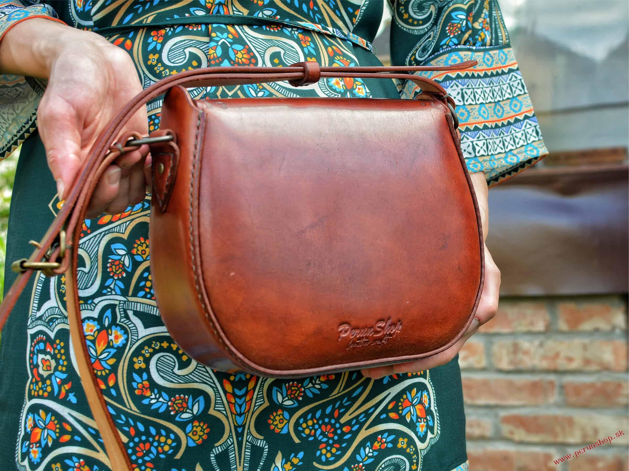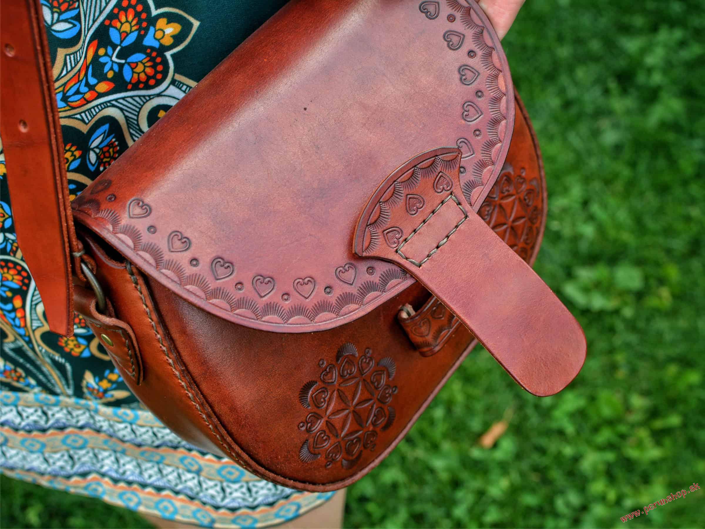 Na zákazku tvorená kožená kapsa. Doplnená o zdobenie v slovanskom nádychu. Pás cez rameno nastaviteľný s max dĺžkou 125cm (na požiadanie môže byť dlhší). Kapsa je tvorená komplet ručne a to od zdobenia, cez farbenie, až po šitie a hladenie hrán. Pracujeme výhradne s prírodnou hovädzou hladenicou