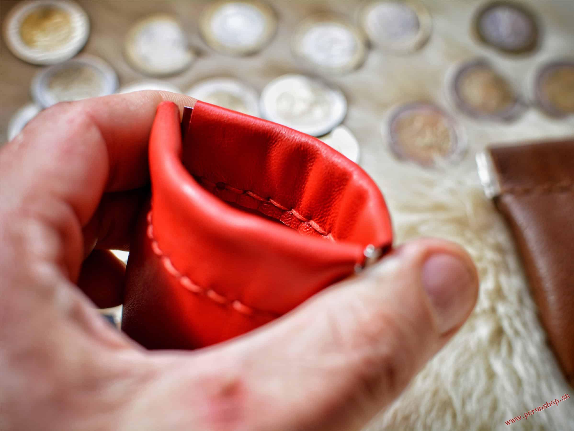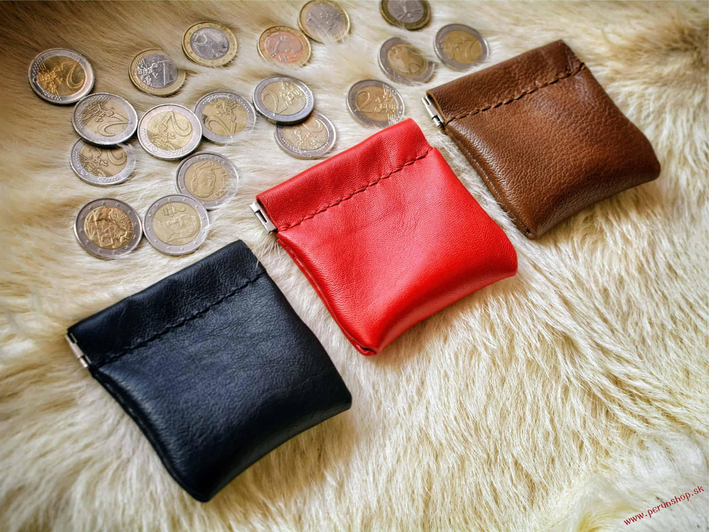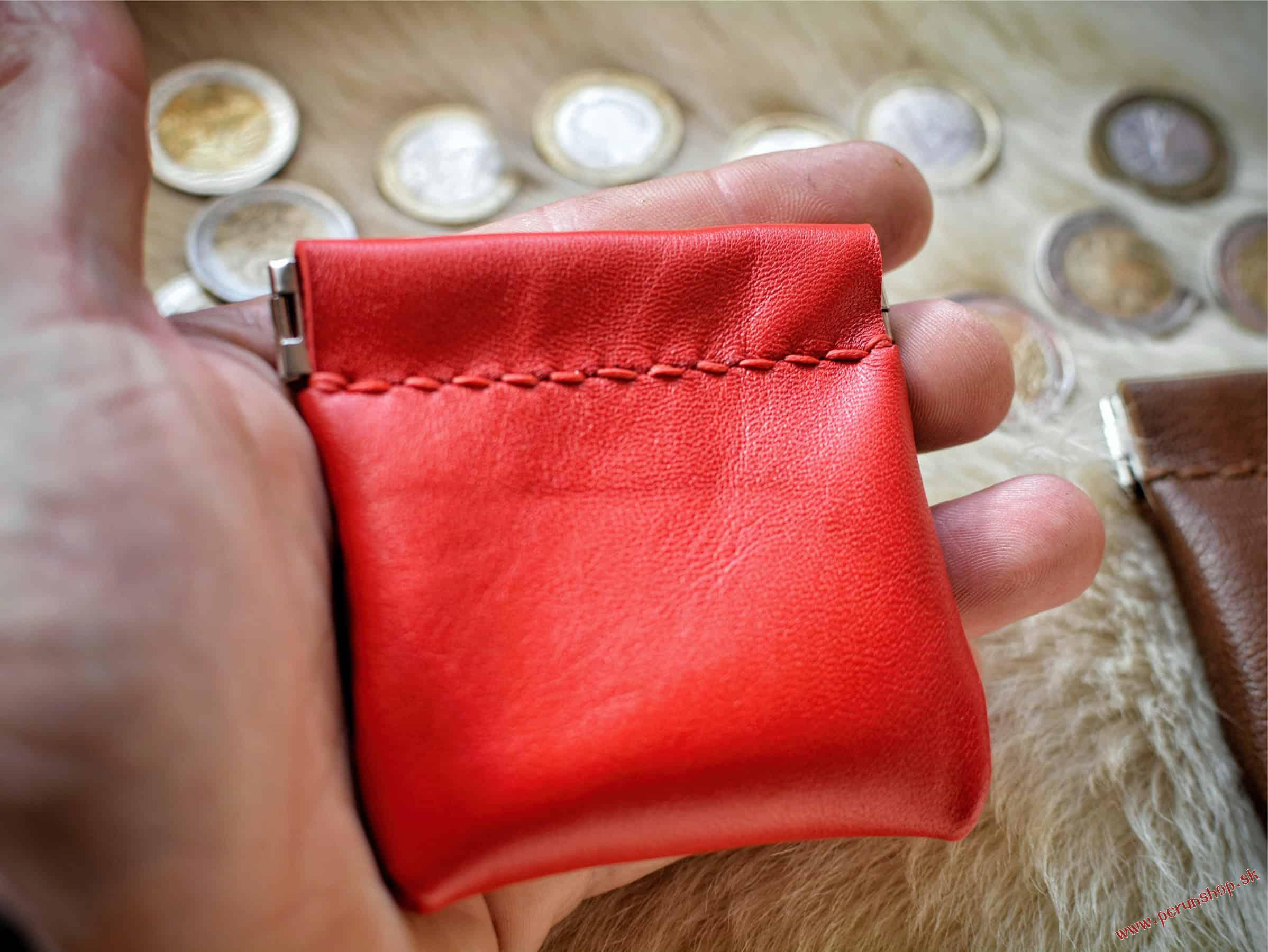 Ručne šité kožené púzdro na mince s kovovým klipom. Zatlačením na hrany klip otvoríte, po uvoľnení tlaku sa bezpečne uzavrie a Vaše mince či iné cennosti ostanú v bezpečí. Vďaka kompaktnému rozmeru 8x8 cm sa pohodlne vojde do kabeliek, tašiek, ale aj vreciek od nohavíc. Pomôže Vám uskladniť a držať po kope Vaše drobnosti, no prioritne je určený pre uchovanie mincí, či zložených bankoviek. Ako materiál sme použili kozinu, ktorá je jemná, príjemná na dotyk. Je poddajná a pritom dostatočne pevná