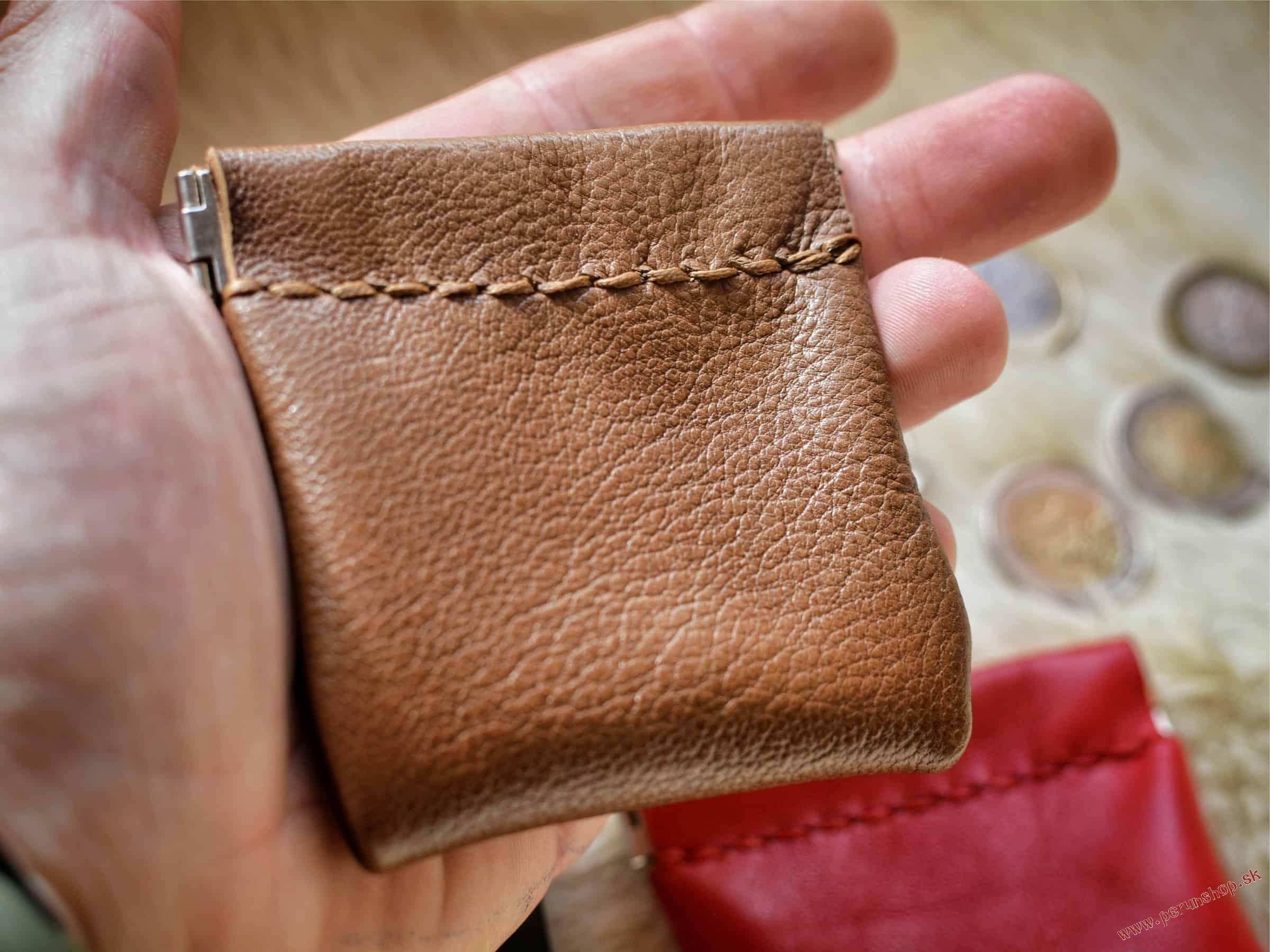 Ručne šité kožené púzdro na mince s kovovým klipom. Zatlačením na hrany klip otvoríte, po uvoľnení tlaku sa bezpečne uzavrie a Vaše mince či iné cennosti ostanú v bezpečí. Vďaka kompaktnému rozmeru 8x8 cm sa pohodlne vojde do kabeliek, tašiek, ale aj vreciek od nohavíc. Pomôže Vám uskladniť a držať po kope Vaše drobnosti, no prioritne je určený pre uchovanie mincí, či zložených bankoviek. Ako materiál sme použili kozinu, ktorá je jemná, príjemná na dotyk. Je poddajná a pritom dostatočne pevná