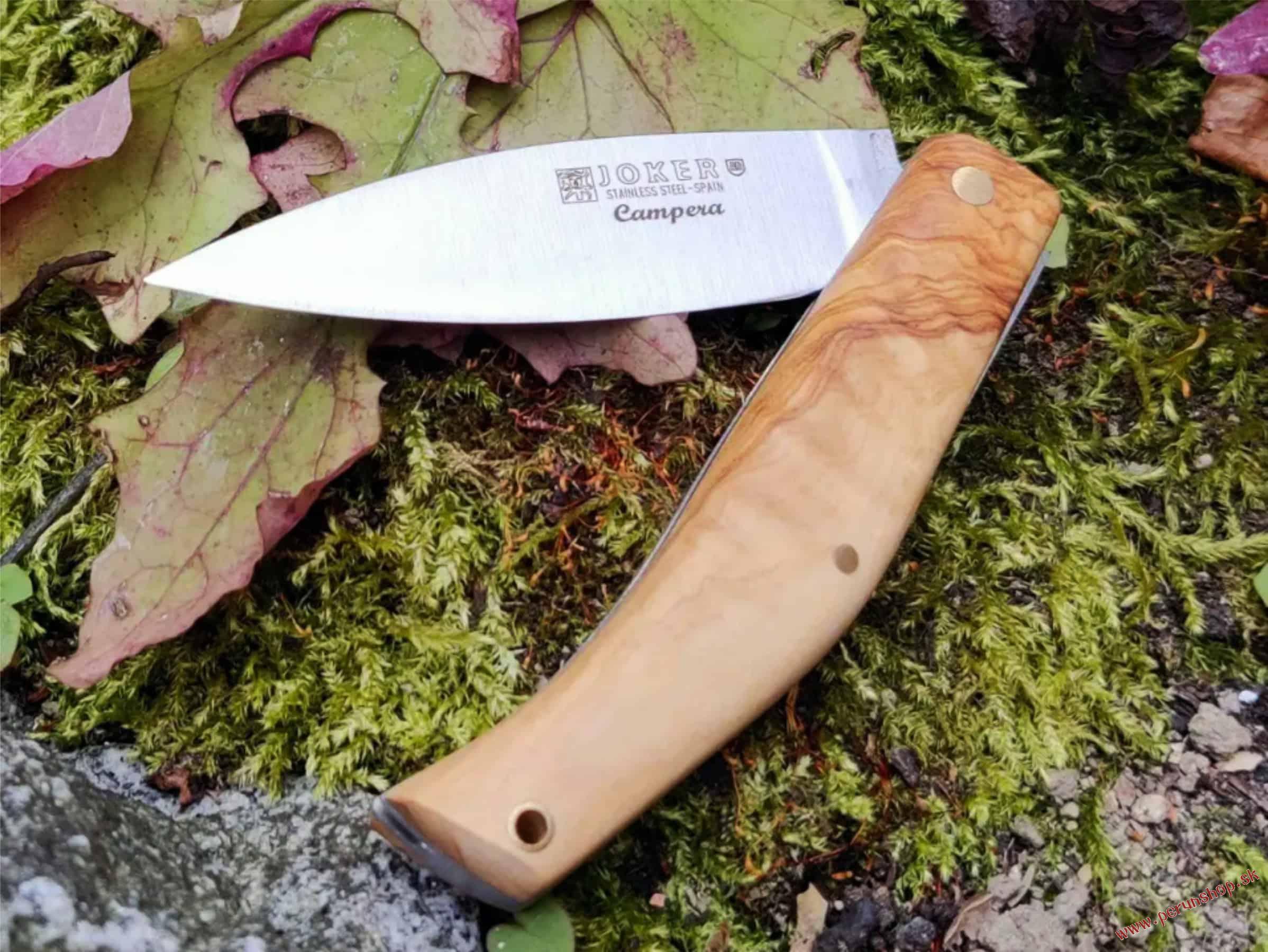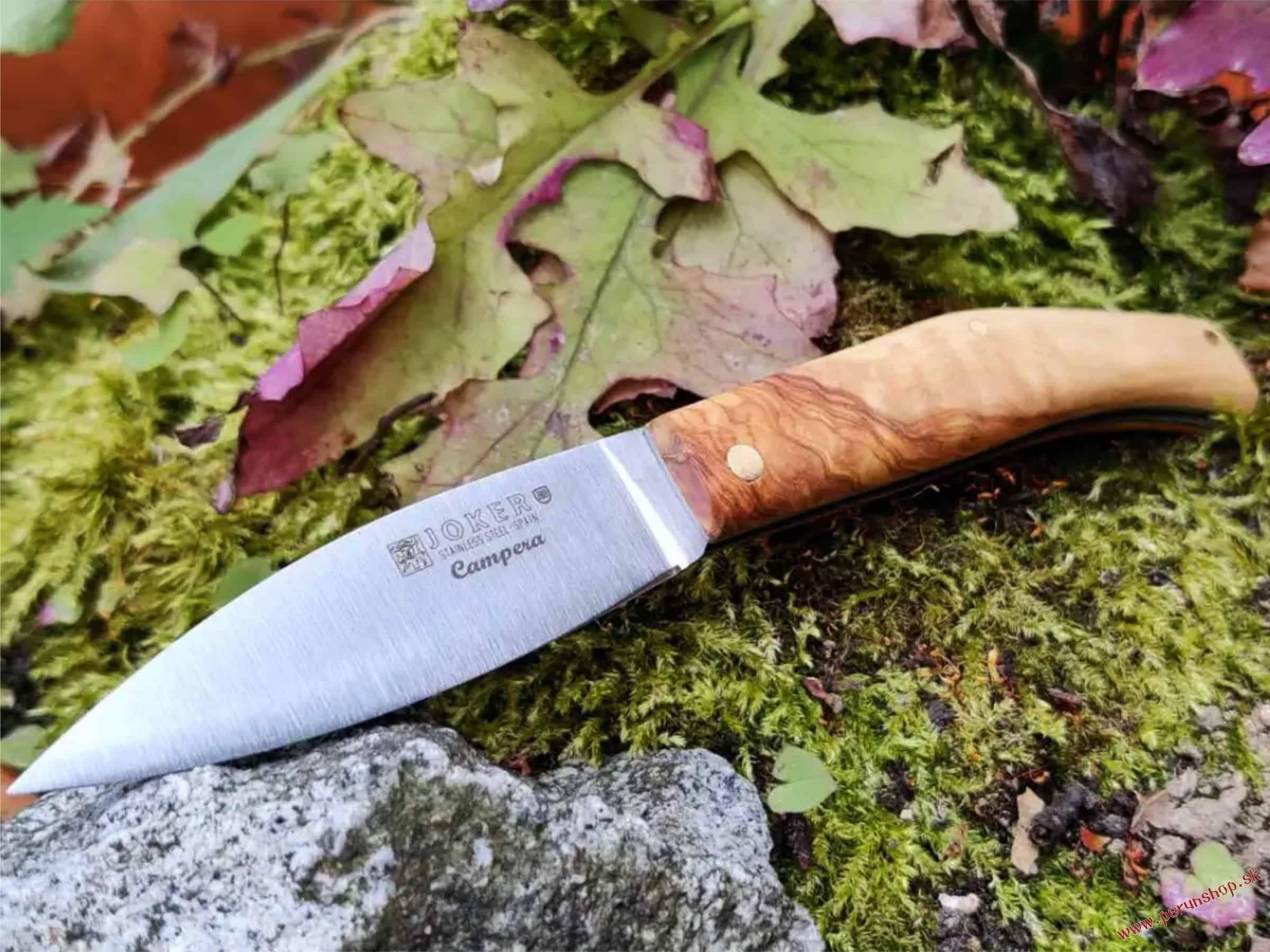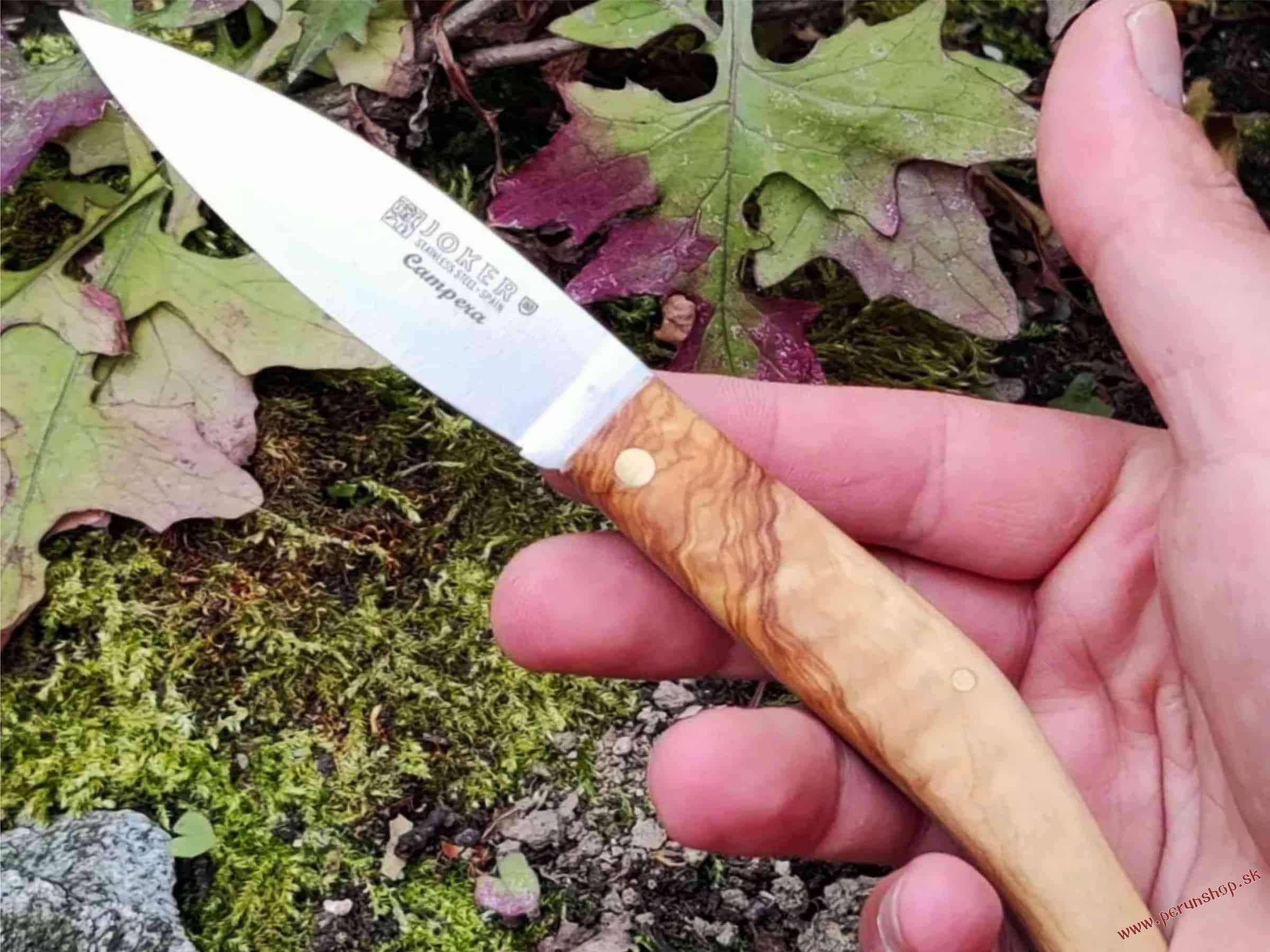 Zatvárací menší nôž Joker Campera sa skvele hodí na použitie v prírode, kemping či turistiku. Mierne zakrivená rukoväť z olivového dreva dodáva nožu celkový prírodný vzhľad a poteší každého outdoorového nadšenca. Čepeľ je v tvare drop point a má saténovú povrchovú úpravu. Nôž je vyrobený z klasickej nehrdzavejúcej ocele X50CrMoV15 a má dĺžku 7,8 cm. Na konci rukoväte sa nachádza otvor na zavesenie šnúrky. Tento typ tradičného noža je typický pre svoju spoľahlivosť a všestrannosť. Nôž je kompletne vyrobený v Španielsku.